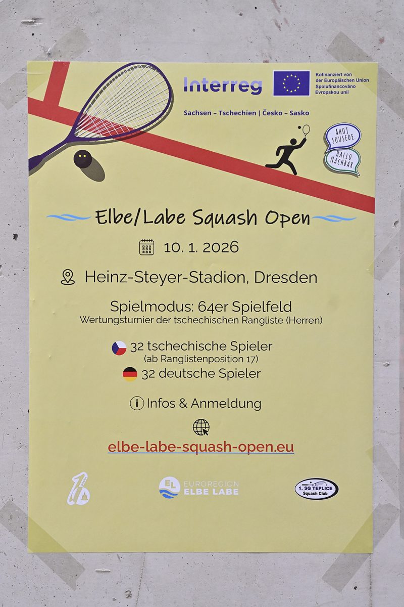 Das 1. Elbe/Labe Open Dresden 2026 wird vom 1. Squash Club Dresden e.V. & 1. SQ Teplice am 10. 1. 2026 mit Hilfe der Euroregion Elbe/Labe organisiert.